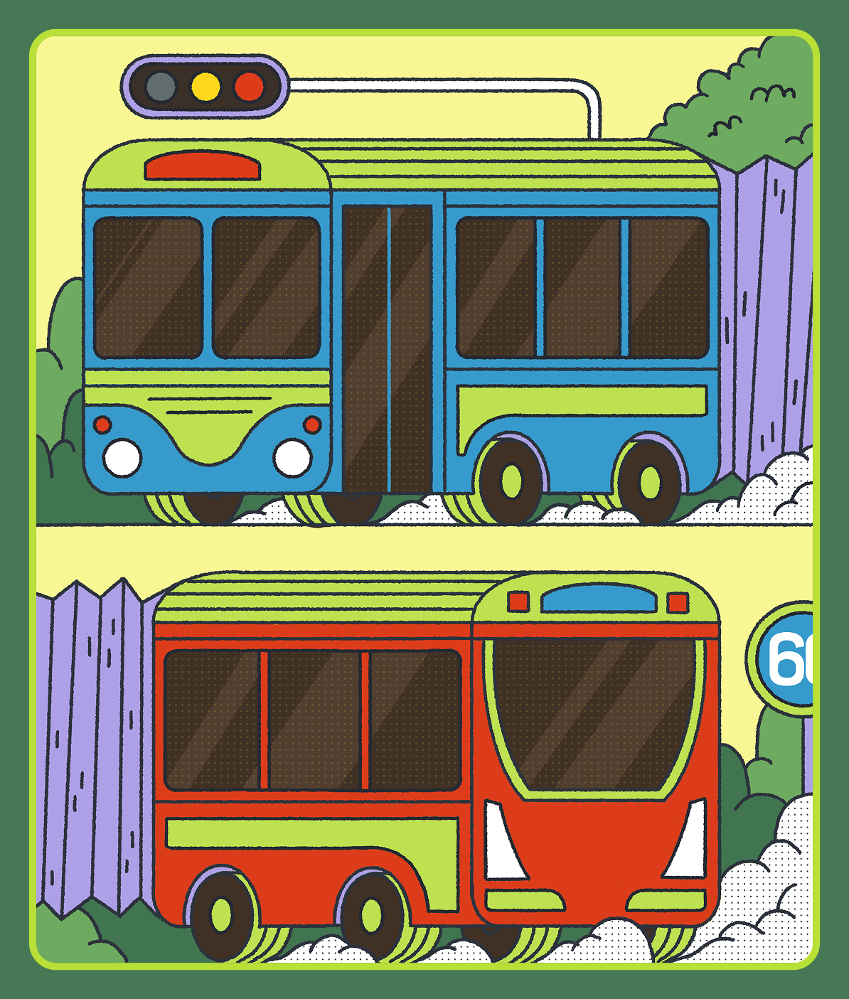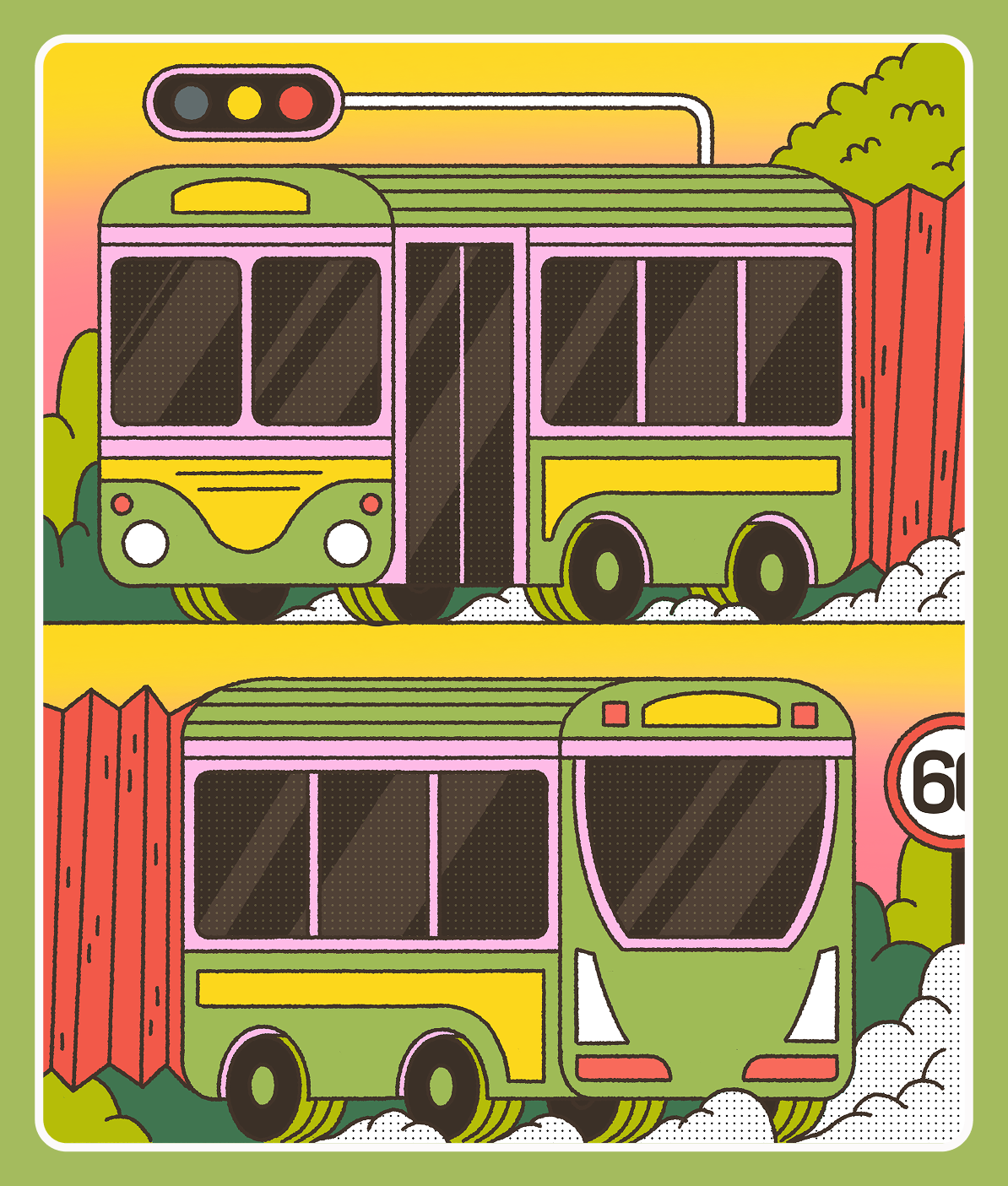 A playful editorial illustration that highlights the last 40 bendy buses that exists in Singapore.