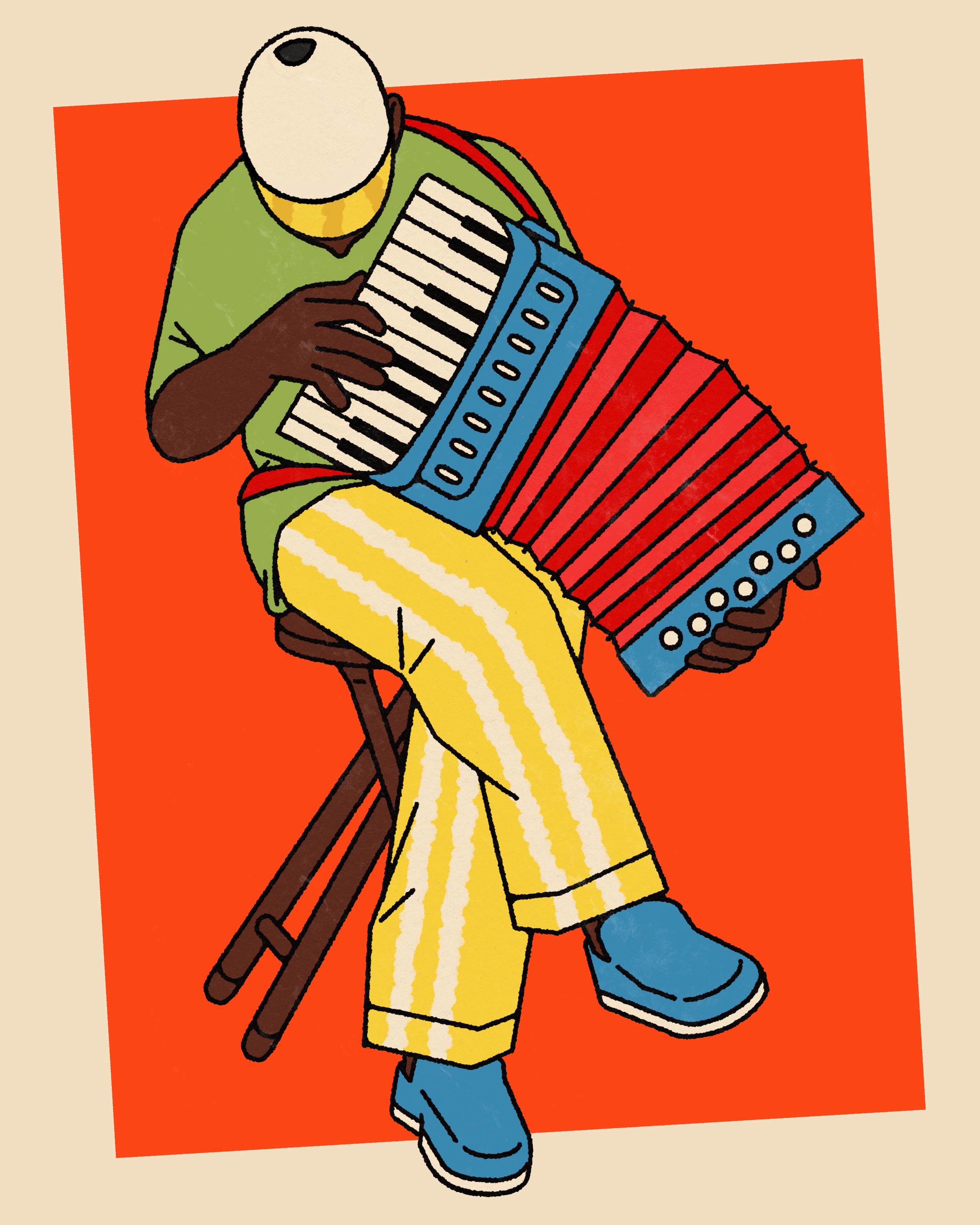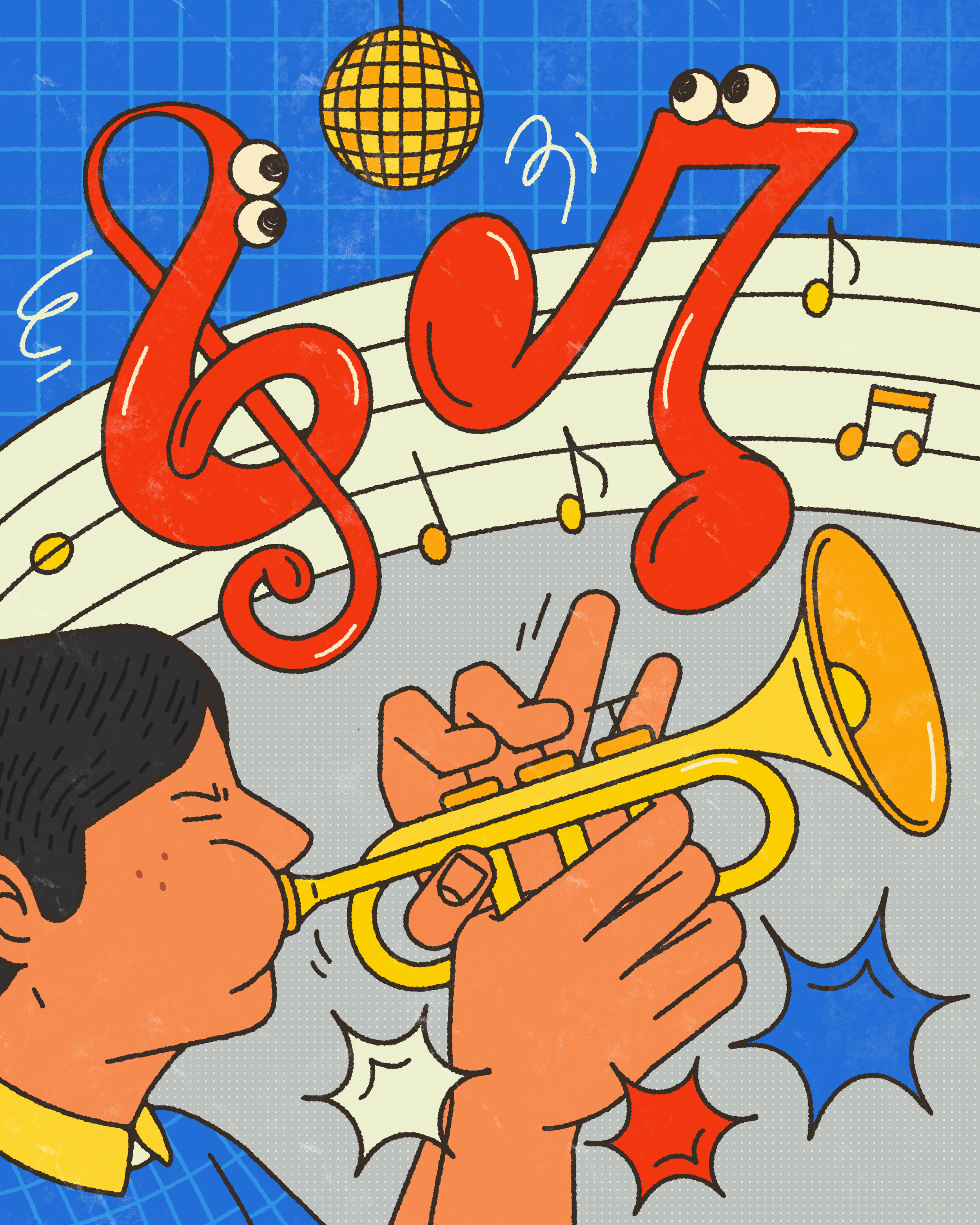 An editorial illustration about the making of jazz music, where improvised melodies take visual form, and music notes come alive as moving characters on the musical score