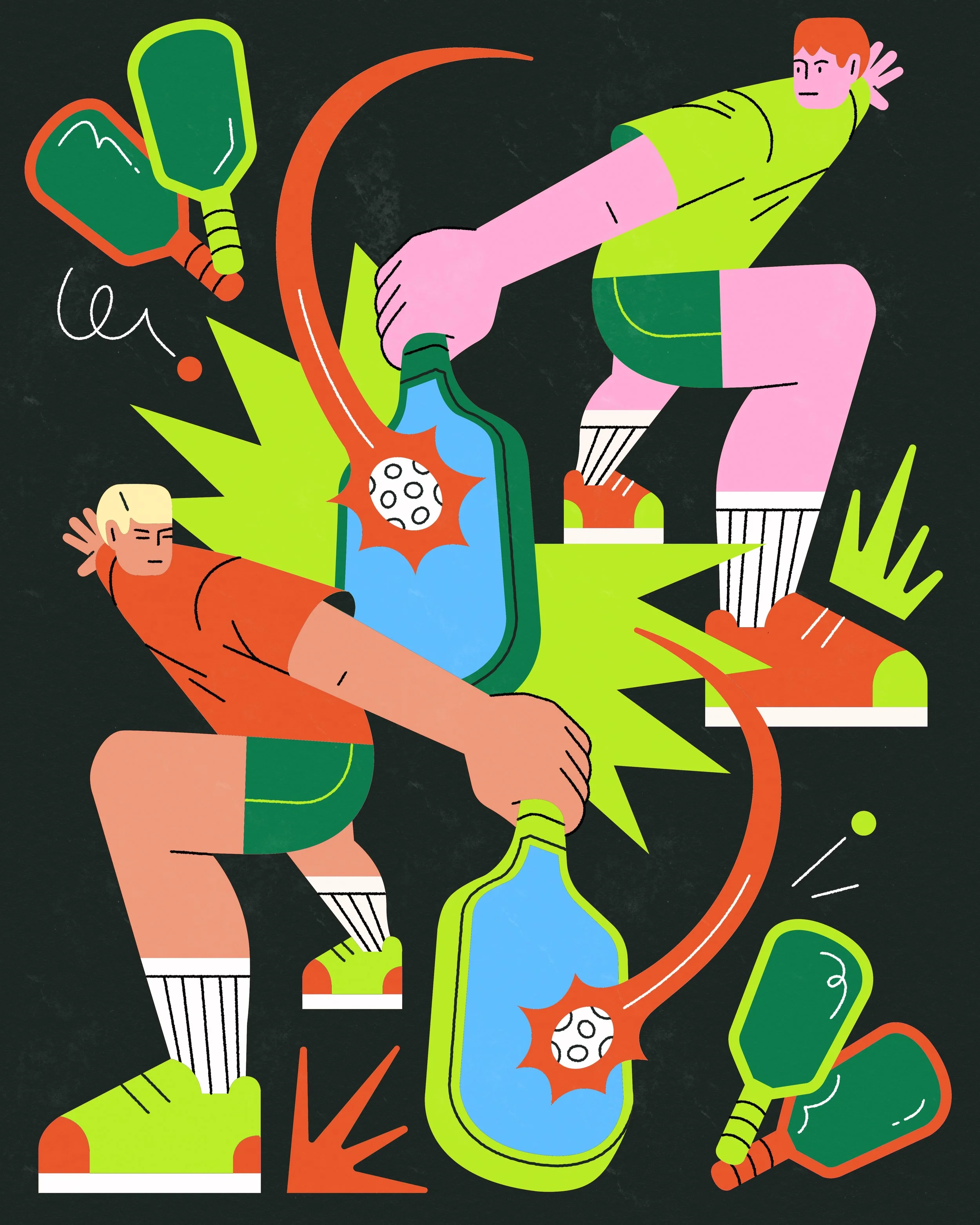 A take on the rise of pickleball, capturing the sport’s fast-paced appeal. The composition exaggerates scale and impact, reflecting both the accessibility and competitive intensity that have fueled pickleball’s rapid popularity.